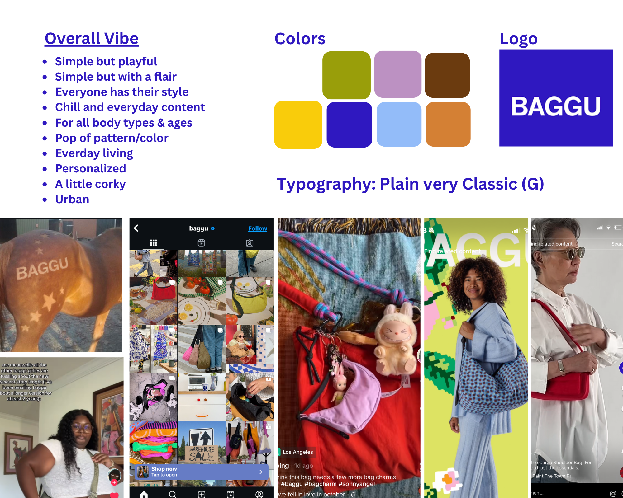 This moodboard captures BAGGU’s balance of simplicity and playfulness through bold color, everyday styling, and inclusive representation. The visual direction emphasizes versatility, personality, and “effortless cool,” reflecting how the brand fits seamlessly into real life while still allowing for self-expression. Bright, unexpected color combinations and casual, user-driven content reinforce BAGGU’s identity as functional, accessible, and a little quirky. Designed for everyone, everywhere.