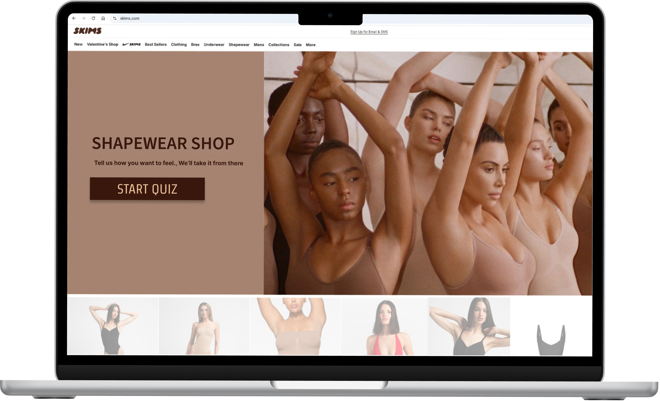 The landing page introduces the SKIMS Fit Quiz as a guided entry point into the shopping experience. It invites users to start the quiz and receive personalized shapewear recommendations, while encouraging them to continue using the experience for future purchases.